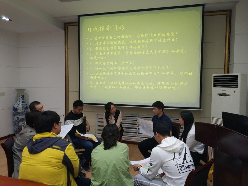 专家运用理论概念宣讲、呼吸放松等技术手段,引导学生进行涂鸦创作,启发学生思考“涂鸦内容与情绪表达、经历的关系”等问题。在随后的分组活动中,学生们介绍自己的作品与创作的感悟,专家通过科学的分析,进行心理分析与辅导,通过色彩、感受和情绪反应的过程,反映出同学们内心深处抽象的、难以被理解的内容,帮助学生走进自己的内心。