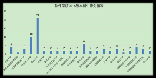 截至目前,2020届本科毕业生推免研究生工作已经基本结束,软件学院共81人获得推免资格,保研率达16.2%。其中:5人推免至北京大学、4人推免至清华大学;51人推免至浙江大学、北京航天航空大学、复旦大学、华中科技大学、哈尔滨工业大学、上海交通大学、武汉大学、南京大学等“双一流”高校;21人选择留在本校读研,占推免生比例25.9%,创学院近年来“保内”新高。