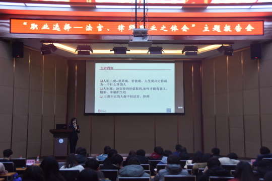 刘律师从自身实际职业经历出发,首先为同学们概述了法学专业学生可能的职业选择与未来规划,同时结合自身的经历阐述了法官与律师的职业特点,分别详细解读了法官与律师两个职业应具有的职业素养、优势与挑战以及二者相互间的关系,她表示,政治素养、专业能力和道德素质是一名好法官和好律师的共同标准,而公正、专业与互相尊重也是二者共同的职业期待。她强调,随着国家司法改革进程的加快,法律从业者的就业环境与社会地位都将逐步得到提升,而作为一名青年法律者,应主动承担责任与使命,为推进依法治国,维护法律的公平、正义,维护社会的和谐稳定不懈努力奋斗。