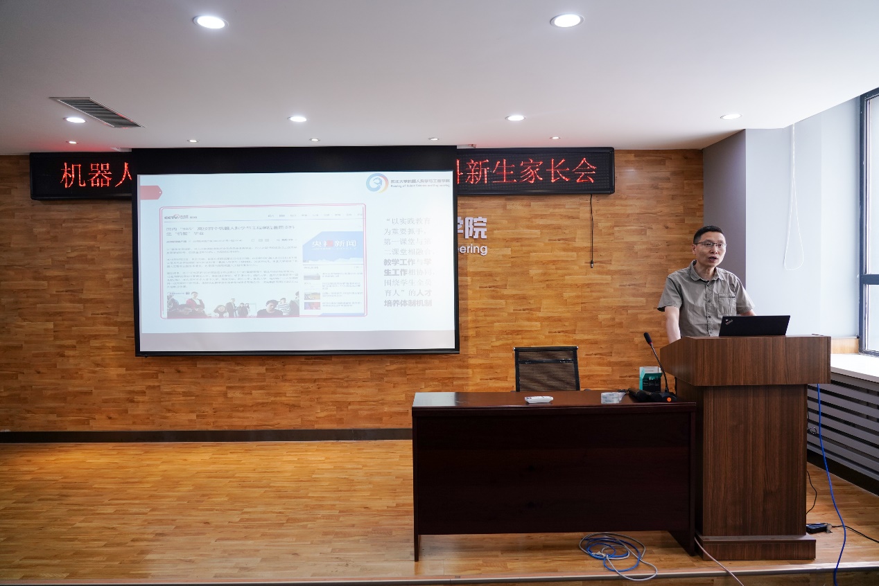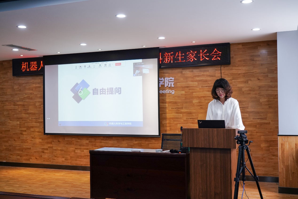 严志刚从“以全员化为方针建设工作体系”“以科学化为统领扩展学生素质能力”两方面介绍了机器人学院“第一课堂与第二课堂相融合,学生工作与教学工作相协同,以实践创新教育为重要抓手,围绕学生全员育人”的人才培养机制。并结合四位优秀学长的成功案例,鼓励学生善总结、多经历、早规划,成为一个对自己的角色和选择负责,有格局、有视野的大学生。最后,他建议家长要“放手但不甩手”,家校配合,共育英才。他还就校园疫情防控相关要求对家长和学生做了提示说明。