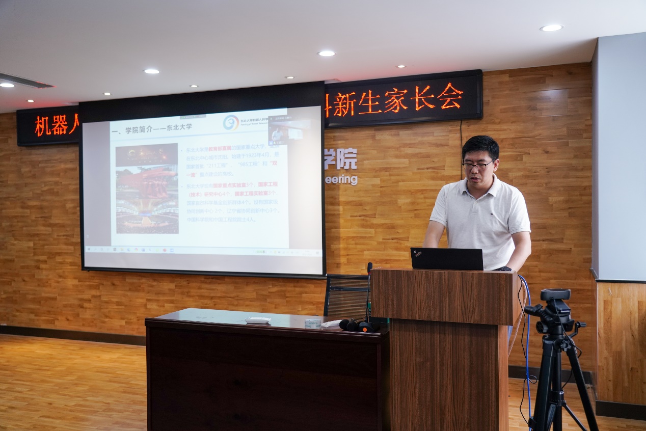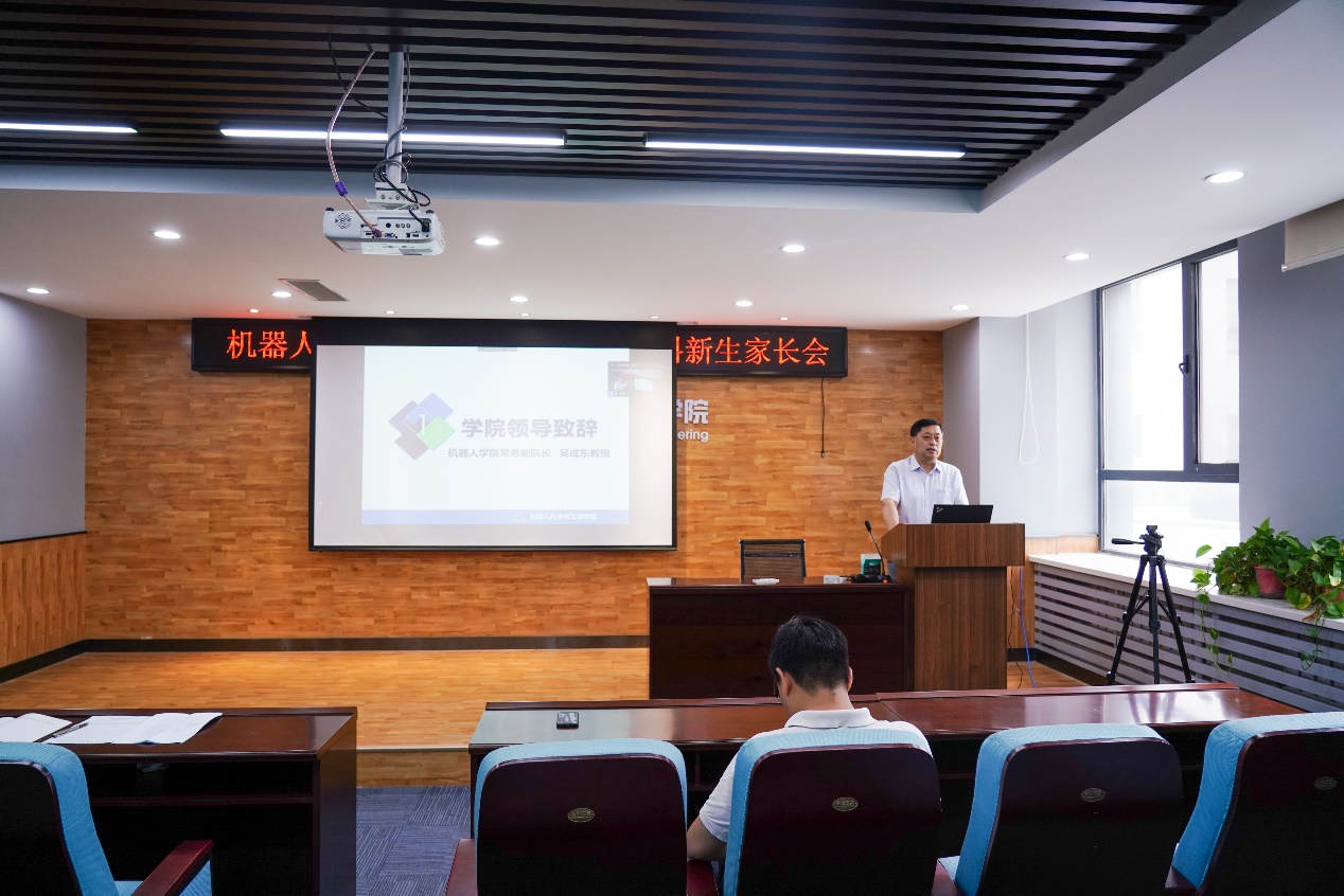 会议正式开始,吴成东首先致辞。他代表全院教职员工向各位考入东北大学机器人学院的同学表示热烈的祝贺和衷心的欢迎。他指出,学院优秀的教学团队、完备的培养体系、先进的实验设备在全国开设机器人专业的高校中居于领先水平,学生将在这里接受先进的专业教育,得到全方位的发展。他同时强调,家长应时刻关注学生的学习状态,督促他们培养自主学习的习惯,尤其要避免沉迷游戏。