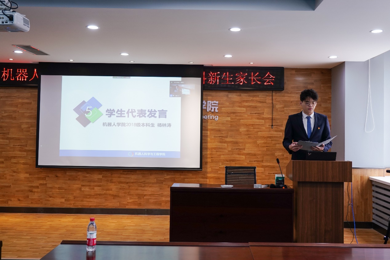 接着,优秀本科生代表、机器人1802班杨林涛同学向新生家长们汇报了自己入学三年来在机器人学院的发展成长经历。