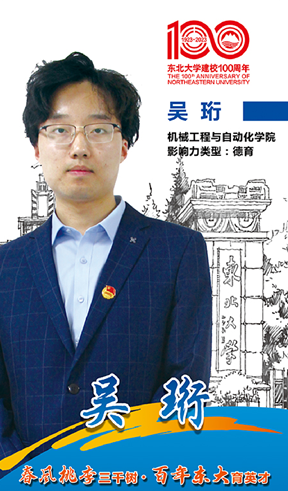机械工程专业2019级本科生,共青团员。曾获国家奖学金、沈阳市周口商会奖学金、北京SMC教育奖学金、校一等奖学金、校二等奖学金等十余项;曾获东北大学优秀学生标兵、东北大学优秀团员标兵、沈阳市优秀毕业生等荣誉称号;在助力“乡村振兴”事业方面有突出贡献,被中国青年报、共青团中央、创青春等媒体平台报道;曾获第十三届“挑战杯”中国大学生创业计划竞赛国家级银奖、TRIZ杯第九届中国大学生创新方法大赛国家级二等奖、第十五届节能减排大赛国家级三等奖、第八届中国国际“互联网+”大学生创新创业大赛国家级铜奖、2022年“挑战杯”辽宁省金奖、第八届“互联网+”辽宁省金奖、“创青春”科技组金奖、“大学生创新创业训练项目”省级良好结题,曾参加日本大阪大学境外学术交流活动。现推免至清华大学攻读硕士研究生。