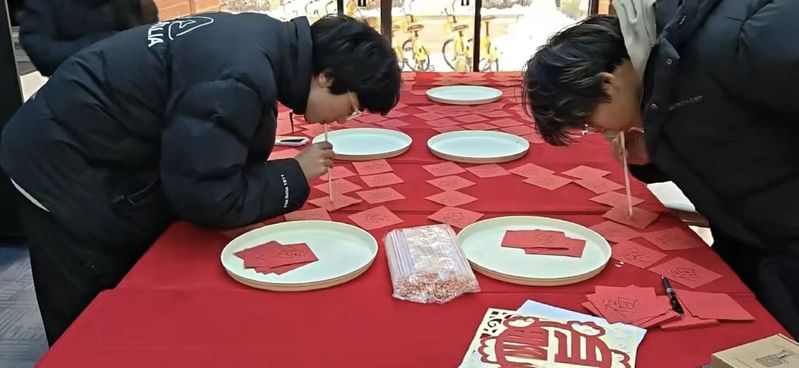 “凝神执毫,红纸上的春联对仗工整,福字圆润饱满!”围桌创作的同学们互相切磋笔法,一撇一捺间都是对新年的期待。有同学说:“平时自己练书法,这次和邻桌小伙伴一起写福字,聊得超投机,感觉邻里关系一下子就近了!”