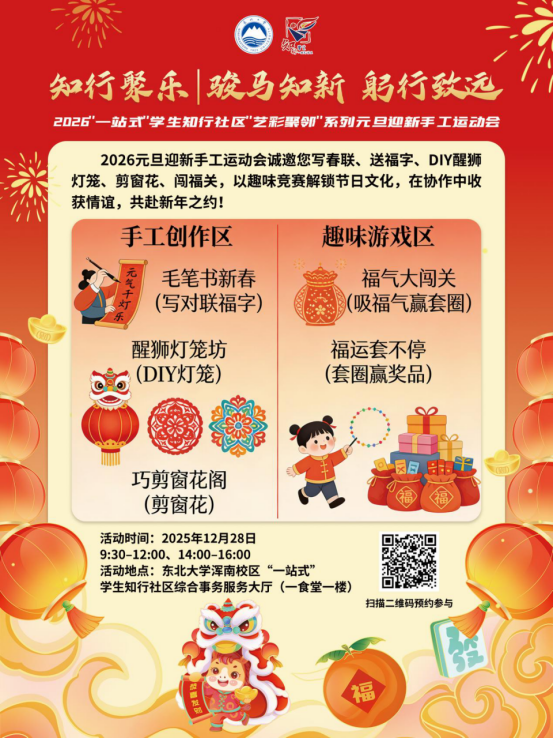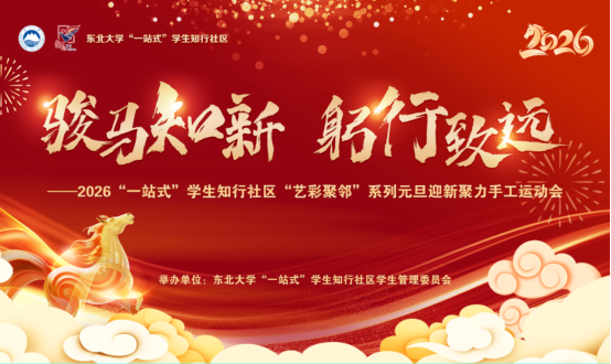 为丰富社区学生课余文化生活、厚植邻里温情,让东北大学全体社区学子在传统民俗体验中感受元旦喜乐,在互动协作中凝聚同心力量,2025年12月28日,东北大学“一站式”学生知行社区学生管理委员会于浑南校区“一站式”学生知行社区综合事务服务大厅成功举办“知行聚乐|骏马知新,躬行致远2026‘艺彩聚邻’系列元旦迎新聚力手工运动会”。